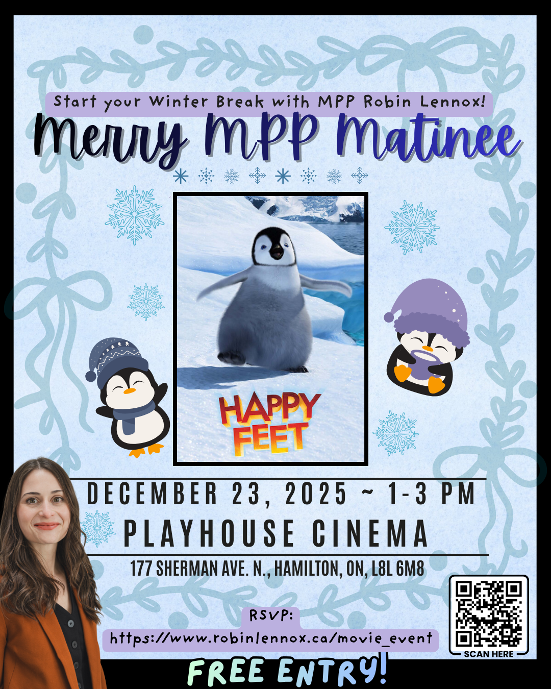 Join MPP Robin Lennox on December 23rd from 1-3PM for a showing of Happy Feet at Playhouse Cinema!