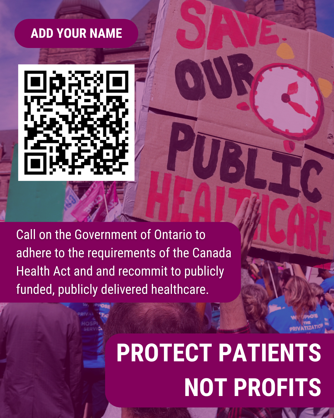 Therefore, we, the undersigned residents of Canada, call on the Government of Ontario to adhere to the requirements of the Canada Health Act and and recommit to publicly funded, publicly delivered healthcare.