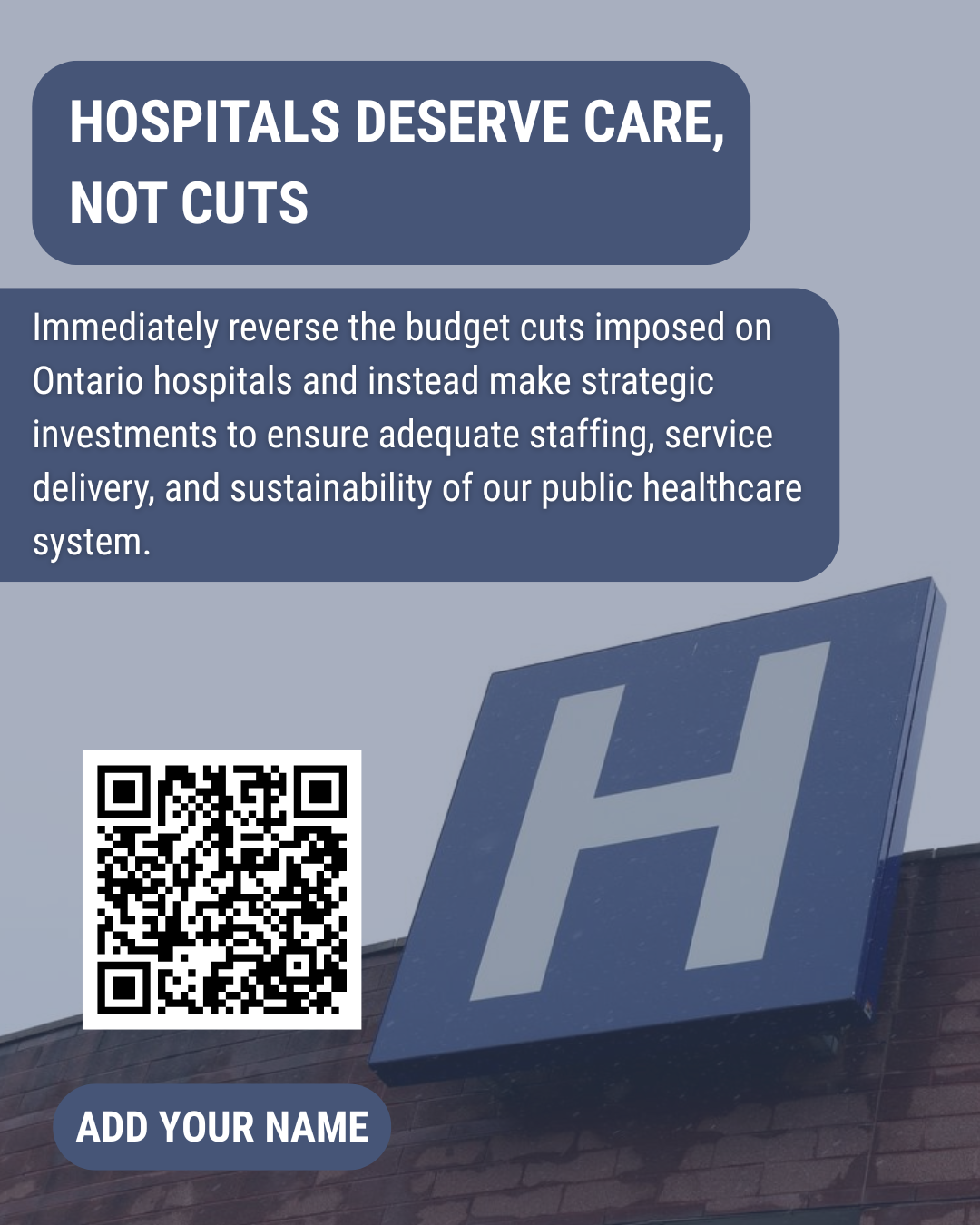 Immediately reverse the budget cuts imposed on Ontario hospitals and instead make strategic investments to ensure adequate staffing, service delivery, and sustainability of our public healthcare system.