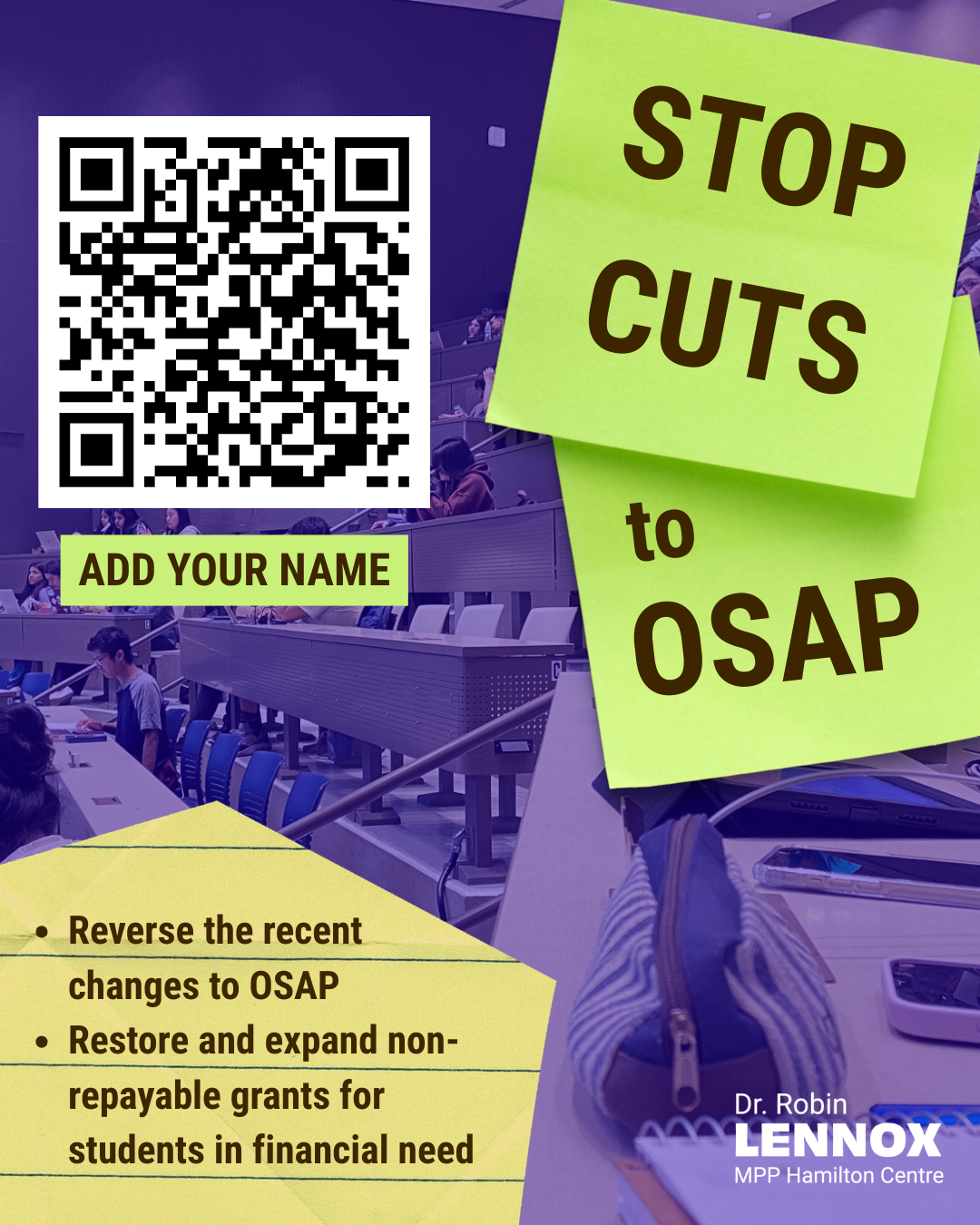 THEREFORE, we the undersigned petition the Legislative Assembly of Ontario to reverse the recent changes to OSAP, restore and expand non-repayable grants for students in financial need, and work with students to ensure a fair, affordable, and accessible post-secondary system for Ontarians.