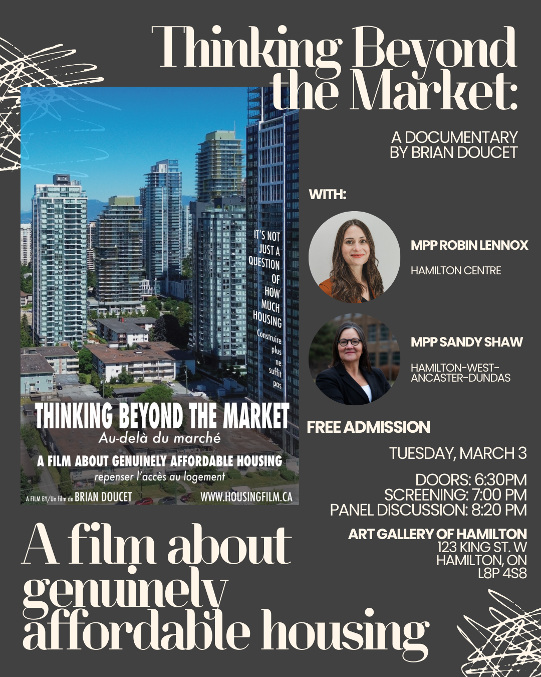 Join MPPs Dr. Robin Lennox (Hamilton Centre) and Sandy Shaw (Hamilton-West-Ancaster-Dundas), along with author, filmmaker, photographer, researcher, award-winning teacher and Associate Professor in Planning at the University of Waterloo, Dr. Brian Doucet for a screening of Thinking Beyond the Market: A film about genuinely affordable housing. Please join us for a panel discussion, following the documentary screening to discuss housing and what can be done in our communities.